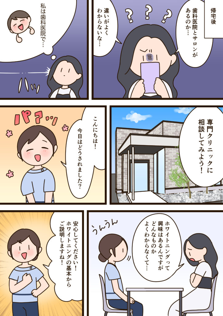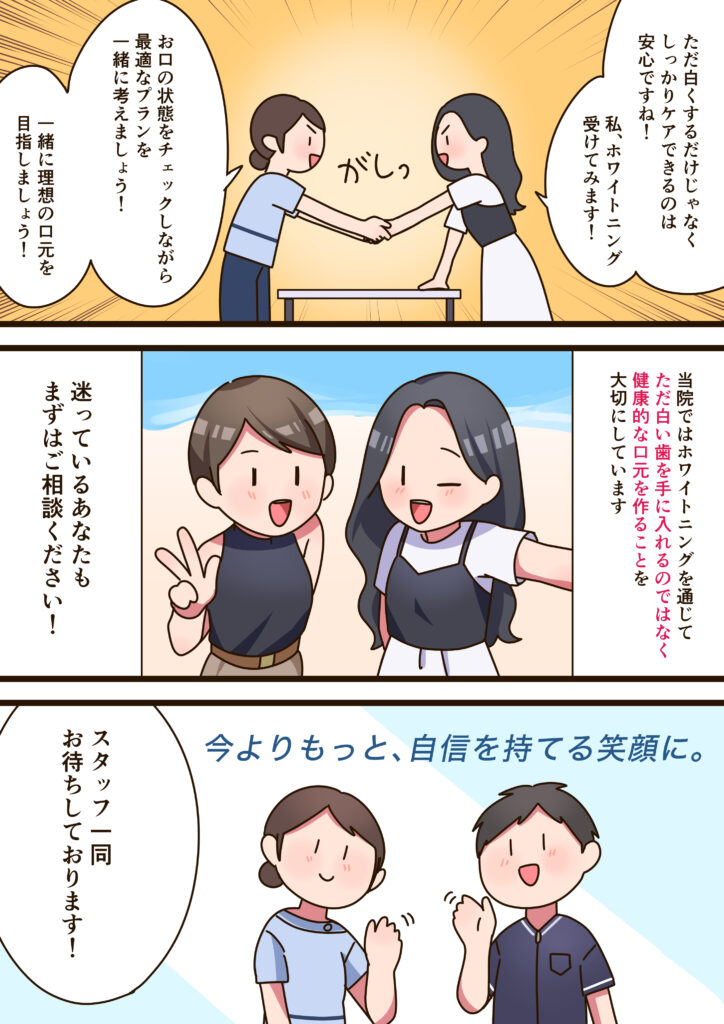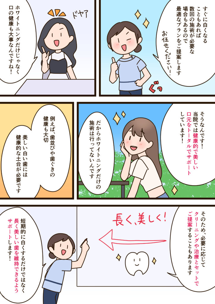 なりたい白さのイメージや、ご希望の施術期間によっておすすめのコースをご提案致します。歯の状態や、色味、望む白さなど、総合してご提案致しますのでお気軽にお尋ねください。