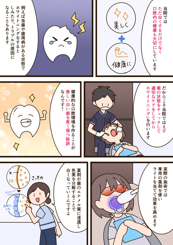 歯科医師と歯科衛生士の管理のもとで行うため、安全性の高いホワイトニングの方法です